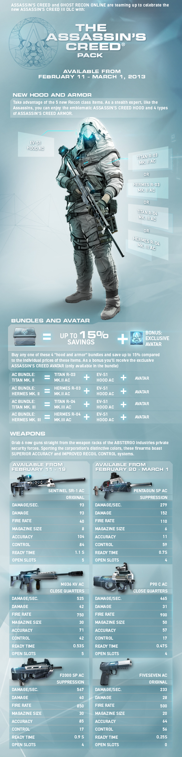 החברה הודיעה שלזמן מוגבל, פריטים מתוך המשחק AC3, יוכלו להירכש למשחק החינמי שלה, Ghost Recon Online. המכירה המיוחדת תתקיים בין התאריכים 11/2-01/03.