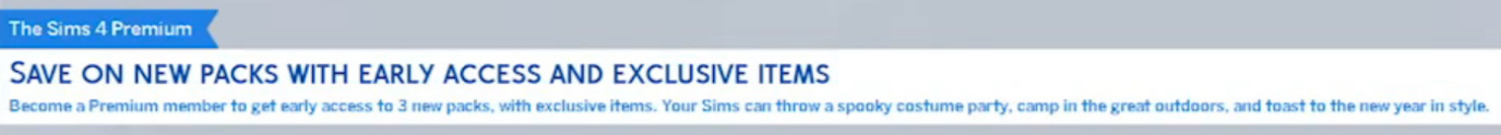 בסרטון Gameplay חדש בן 20 דקות (מצורף למעלה) שהנחו ריין וון וגרהם נרדון – מובילי הפיתוח של הסימס 4. הוצג אזכור לאפשרות לקניית פרימיום למשחק (את ההודעה גילה האתר Simgoodie), לא ידוע יותר מדיי על הפרימיום במשחק מתוך ההודעה הקטנה שהופיעה לשנייה בסרטון לפני שהמסך עבר. ככל הנראה, זהו לא משהו שהיה אמור לקרות והחשיפה על הפרימיום של המשחק כנראה תגיע מאוחר יותר באופן רשמי, למרות זאת מה שאפשר ללמוד מההודעה הקצרה היא שבעלי הפרימיום יקבלו גישה מוקדמת לשלוש חבילות הרחבה שעדיין לא הוכרזו.